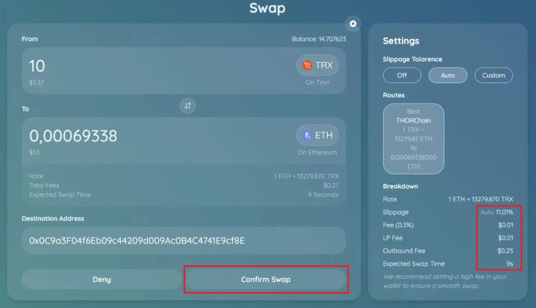 • Note on slippage: High slippage is normal for small swap amounts (like $3), which is due to the outbound fee (e.g., 25 cents) being a significant percentage of the small trade. For larger trades, the slippage would be significantly lower (often less than 1%).