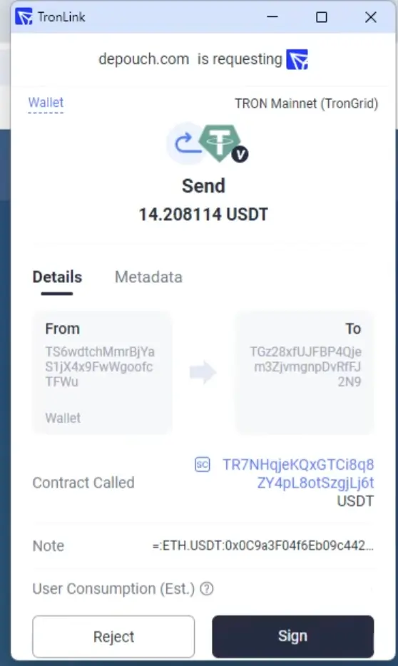 - A prompt will appear in your TronLink wallet. Press Sign to approve the transaction.